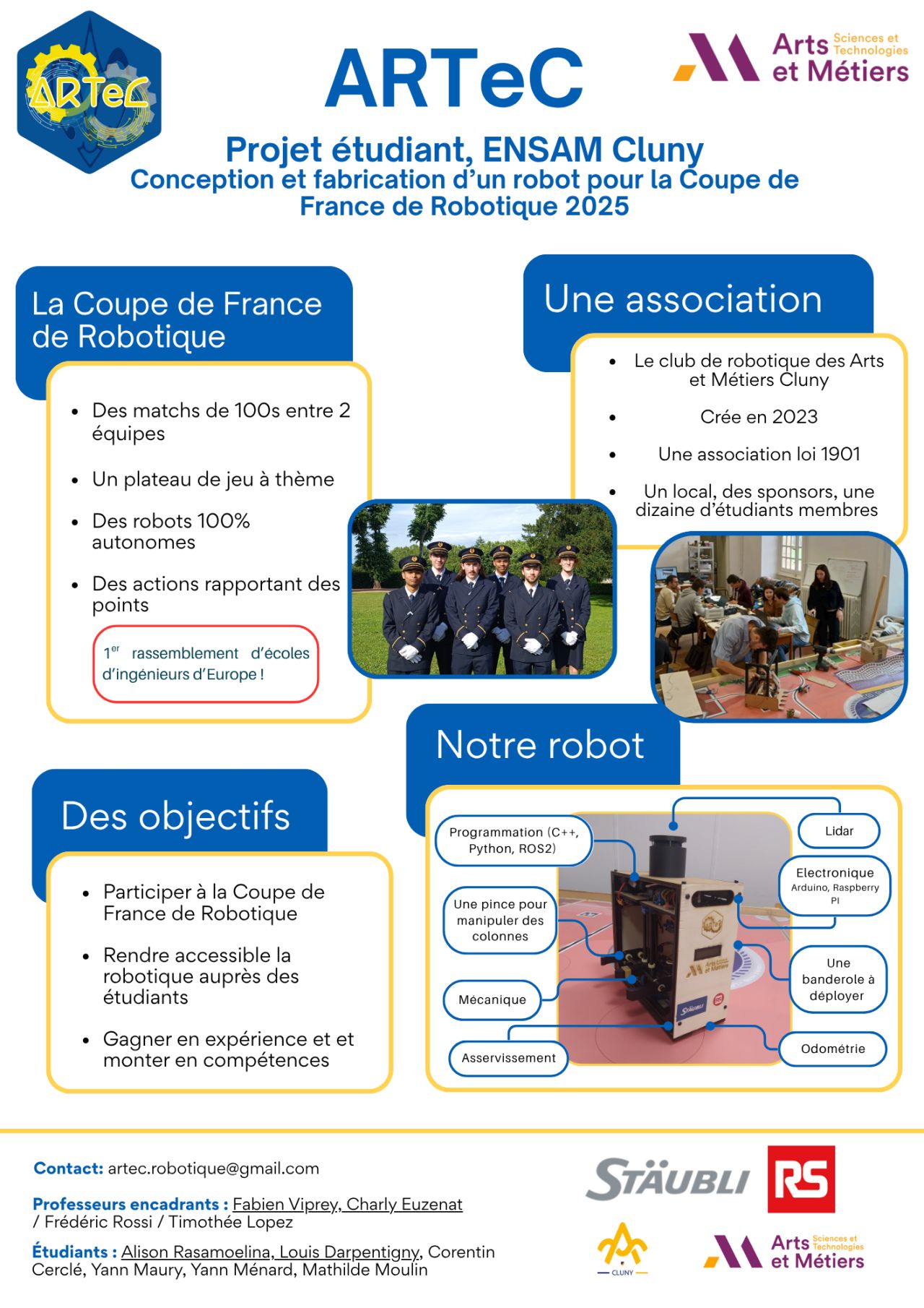 L’association ARTeC Robotique, créée en 2023, vise à participer chaque année à la Coupe de France de Robotique. Après une première tentative non homologuée, l’équipe actuelle a franchi cette étape grâce à la résolution de défis techniques majeurs : conception d’une base mobile, mise en place d’un système de localisation, et programmation d’un déplacement autonome. Ce projet s’inscrit également dans le cadre du programme de deuxième année du Programme Grande École sur le campus Arts et Métiers de Cluny, avec l’accompagnement des enseignants Fabien Viprey et Charlie Euzenat, Frédéric Rossi, Timothée Lopez.