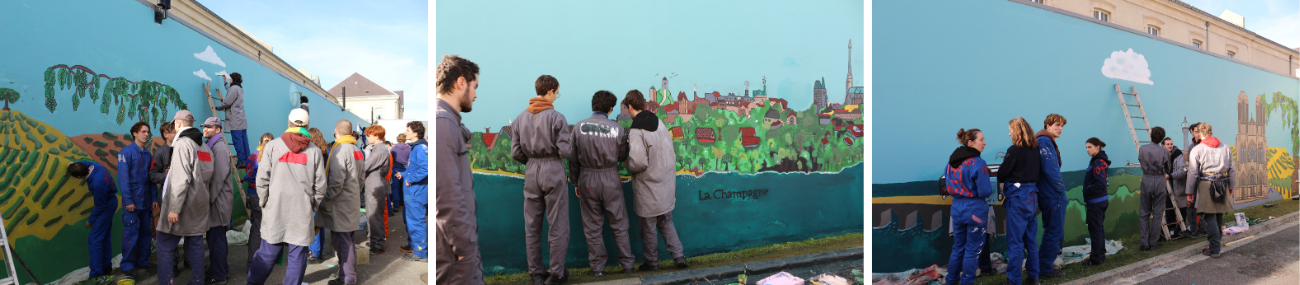 Cette édition restera dans les mémoires grâce à une fresque extérieure exceptionnelle de 42 mètres de long et 4,5 mètres de haut, la plus grande jamais réalisée par les étudiants du campus. Elle met en valeur la région champenoise avec la cathédrale de Reims, le phare de Verzenay, la tour Castellane et les vignobles de la Marne, créant un repère visuel fort pour les patients et le personnel.