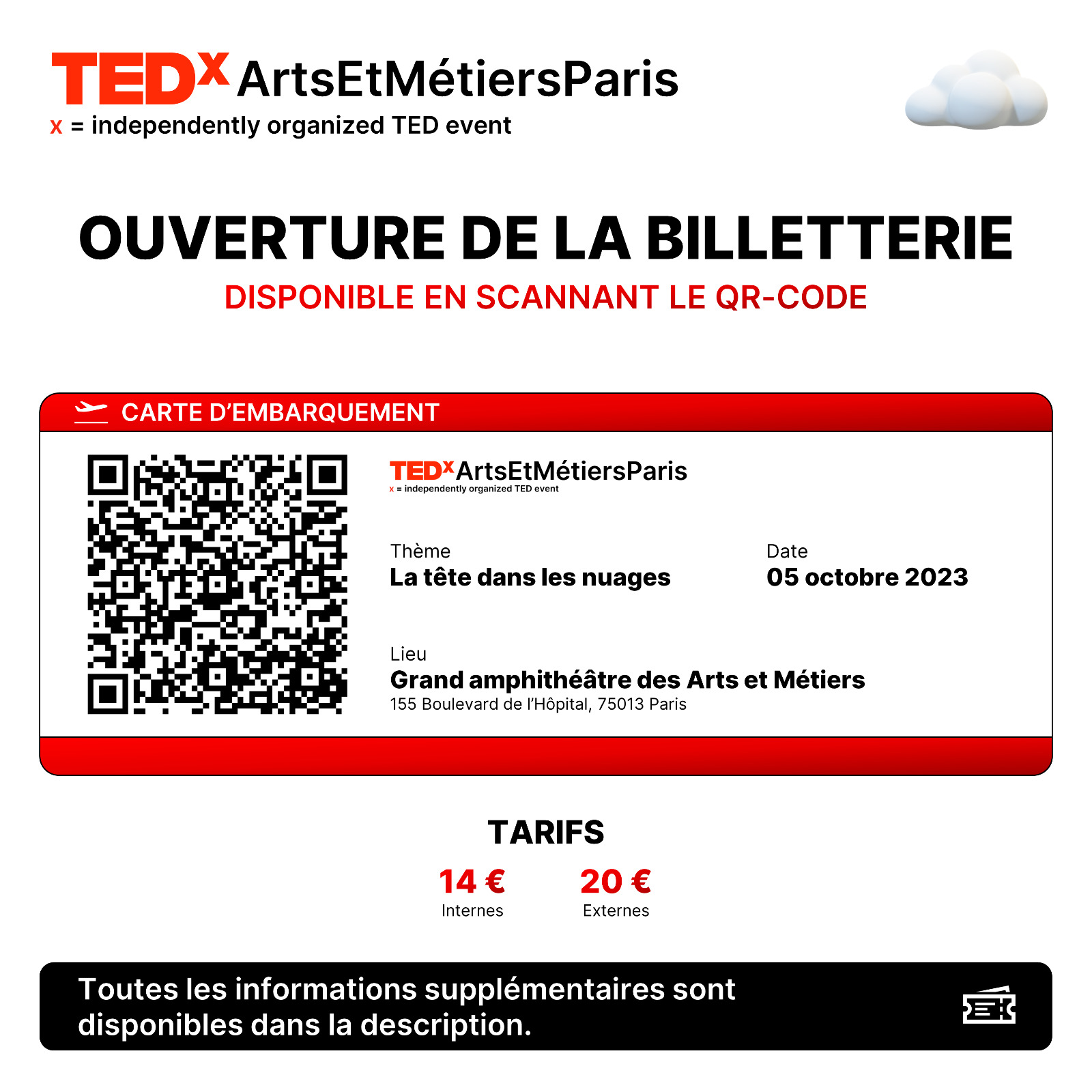 Pour ceux intéressés à rejoindre cet événement, les billets sont disponibles sur la billetterie en ligne: https://www.helloasso.com/associations/tedx-arts-et-metiers-paris/evenements/billeterie-conference-tedxartsetmetiersparis
