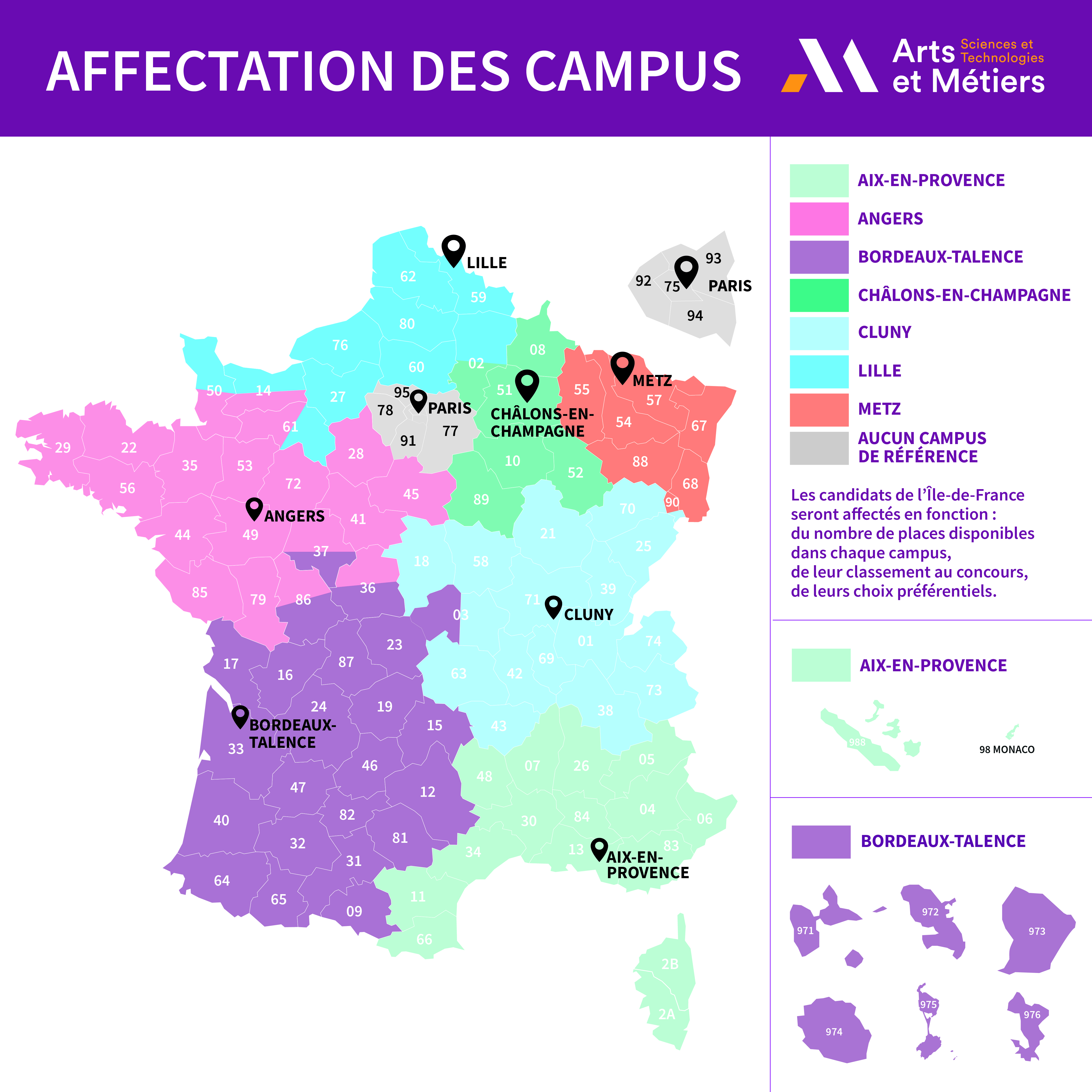 - de leur campus de référence le cas échéant, à condition qu'il soit classé à l'une des 2 premières places des vœux préférentiels pour le cursus étudiant ou à la première place pour le cursus apprenti. (voir cartes ci-dessous),