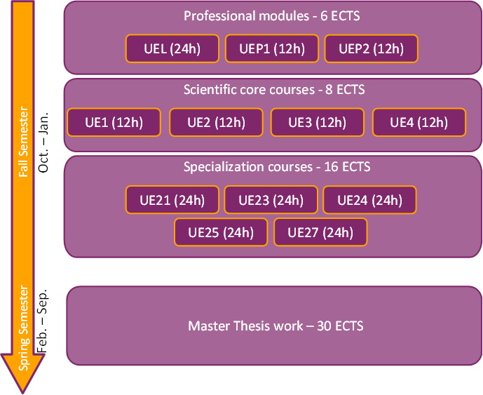 This semester is dedicated to lectures and courses. These ones are composed by 4 scientific core courses of 12h each, 4 specialisation scientific modules 24h each (to choose among 5 proposed), 1 language module of 24h, 2 professional courses, for a total of 30 ECTS. - Spring semester (S4): From February to September